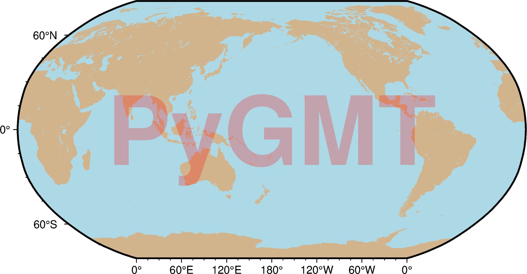 You should see a global map with land and water masses colored in tan and lightblue respectively. On top, there should be the semi-transparent text “PyGMT”. If the semi-transparency does not show up, there is probably an incompatibility between your GMT and Ghostscript versions. For details, please run pygmt.show_versions() and see Not working transparency.